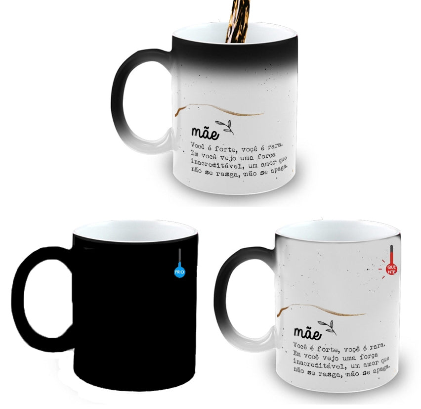Ao adquirir esta Caneca Mágica, você recebe a caneca preta e ao esquentar a cerâmica, despejando liquido quente ou colocando no forno a estampa aparece. Ao esfriar a caneca volta a ficar preta, repetindo o processo todas as vezes.
